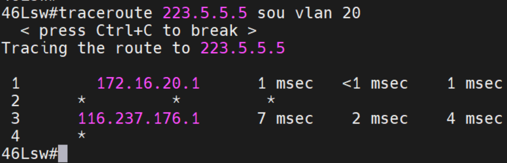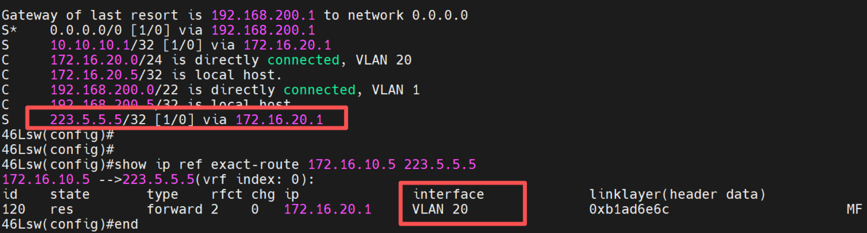 添加一条ip route 223.5.5.5 255.255.255.255 172.16.20.1的明细路由,指定流量从vlan20转发