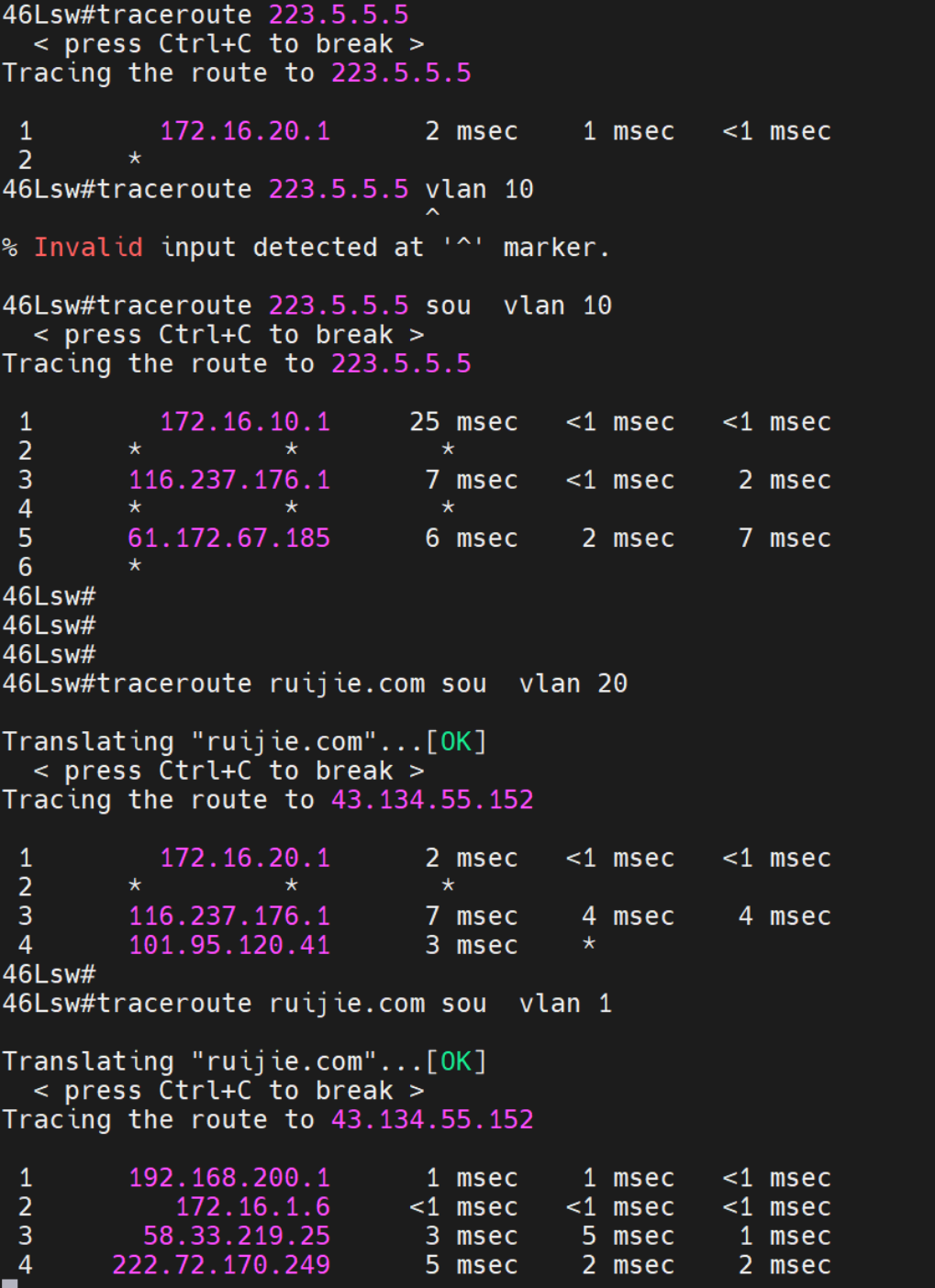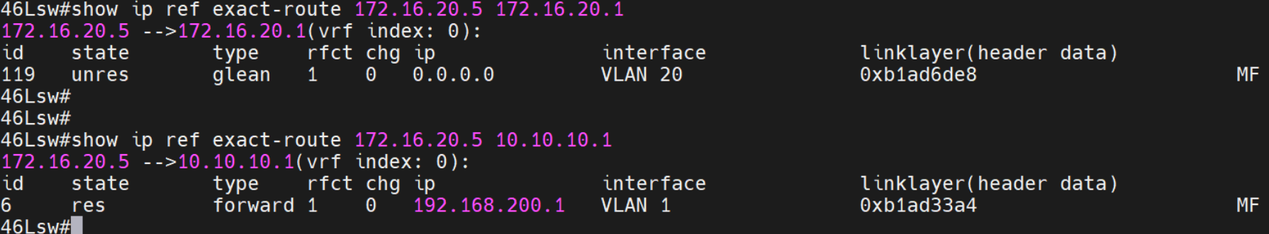 show ip ref ex <源地址> <目的地址>从接入交换机上带源地址测试,查看流量从哪个接口转发。发现流量从vlan1转发